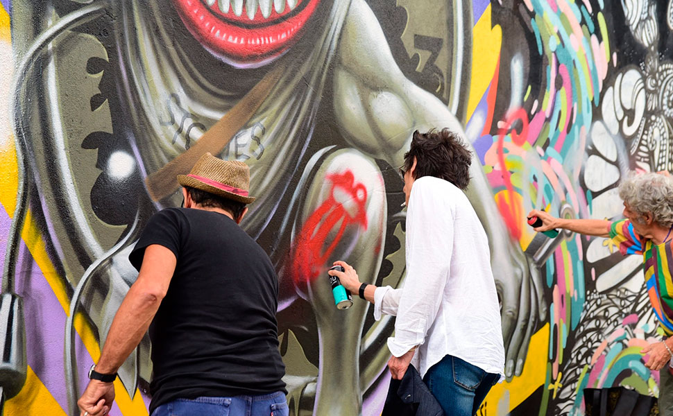 Ron Wood revê amigo brasileiro e grafita boca do Rolling Stones em SP
