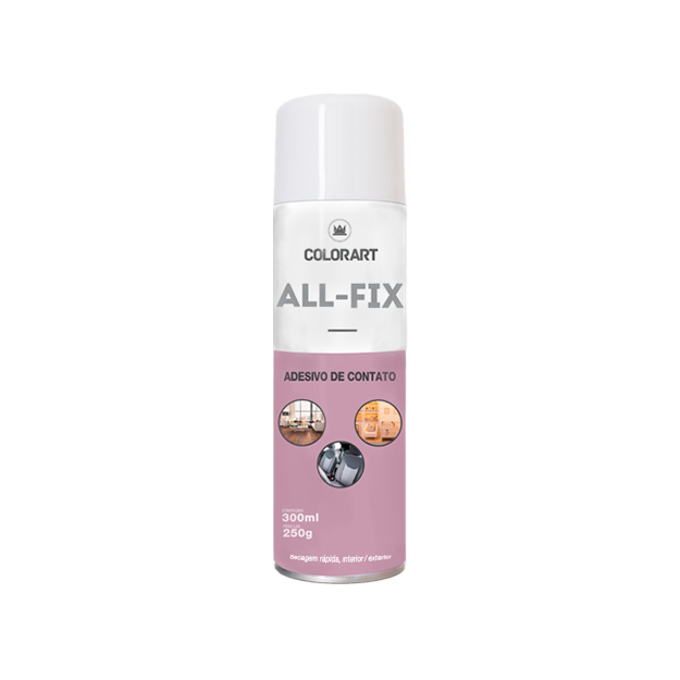 Colorart ALL-FIX – Adesivo de Contato é uma cola em spray com alto rendimento, que proporciona rapidez e praticidade na colagem. É indicada para a colagem de espumas P.U. entre si, ou com madeira, tecidos, bancos e tetos de automóveis e etc.